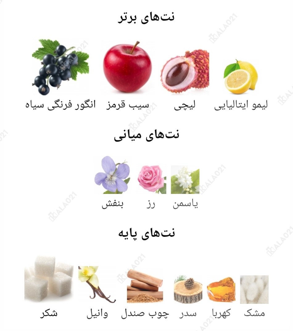 نت پایه (Base): شکر، وانیل، چوب صندل، سدر، کهربا، مشک